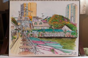 私のこの絵のなかでは、奥のテーブル席で大勢の客が談笑しているが、ひょっとすると上に引用した主人公とSさんのこの会話風景が繰り広げられていたのも、まさに私が描いていたこのときで、あの席のどれかひとつでだったのかもしれない。