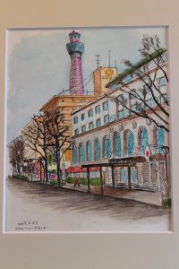 Quand j’étais en train de dessiner ce tableau en m’asseyant au bout de l’Avenue du rivage longeant Parc Yamashita, j’ai remarqué un couple petit âgé qui regardait mon travail en se tenant debout à dos. je leur ai salué, et l’homme qui paraissait très honnête m’a dit “Faire le croquis comme ça, c’est un bon loisir, Monsieur. Je vous envie d’avoir le violon d’Ingres. Moi, je vais être en retraite bientôt, donc il faut trouver quelque passe-temps. Mais, c’est très difficile, hein ?” Sa partnaire souriante lui a approuvé en hochant la tête.